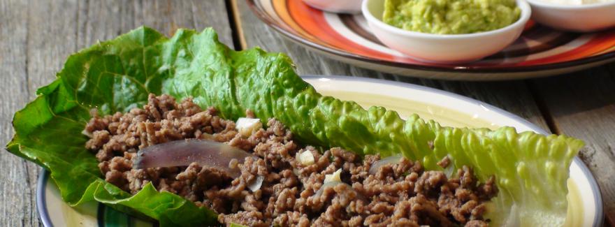 - Fill the lettuce wraps with beef, salsa, guacamole, cilantro, sour cream or Greek yogurt, hot sauce and shredded raw cheddar cheese.