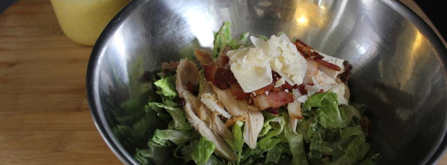 - Place the romaine lettuce and red onion into a large bowl and add the cooked bacon and chicken on top.