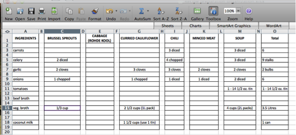 At this point, my friend Isabel even creates a spreadsheet. She lists all of the ingredients down the left side. Across the top she has a column for each ingredient and their quantity. For example, carrots (10), 4 chopped, 6 diced. Then, down the right side, she totals up all of the ingredients.