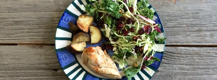 As shown in the table above, you start with protein. Ideally that will come from an healthy animal source and you will have a portion about the size of your palm if you are a woman (double that for men). Then you add a portion of starchy vegetables that is about the size of your hands cupped together (double that for men). Add about a thumb’s length worth of healthy fat (double that for men) and fill the rest of your plate with more vegetables (we always make a large salad).