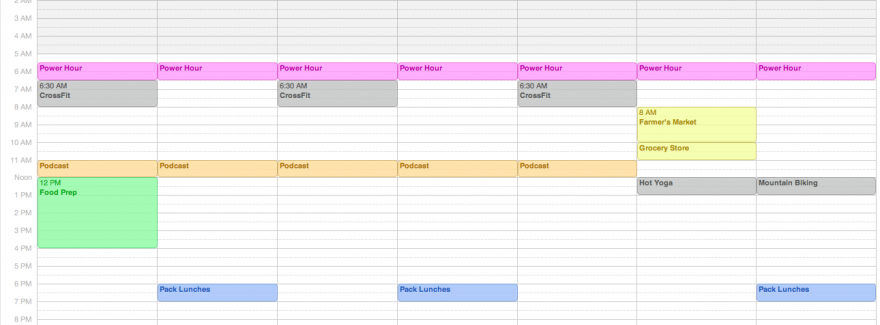 Step #5: Open up your calendar and make it real. Try colour coding each of your tasks. Food prep in green, grocery shopping in blue, batching packing lunches (only pack lunches on Sundays, Tuesdays and Thursdays) in orange, going to the gym is purple, listen to a health podcast like this or this in yellow, and writing in your food log in red.