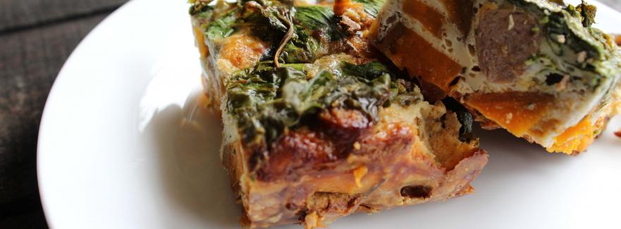 2. Dice the sweet potatoes and add to the bottom of a baking dish.