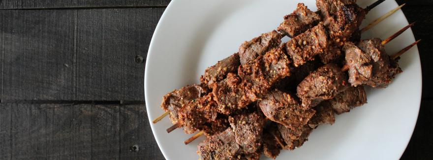 - Assemble the beef on the skewer, placing 5 pieces of beef per skewer.