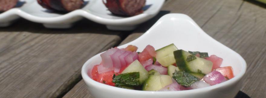 - By Design hummus and veggies or barbecued sausages with watermelon relish for lunch